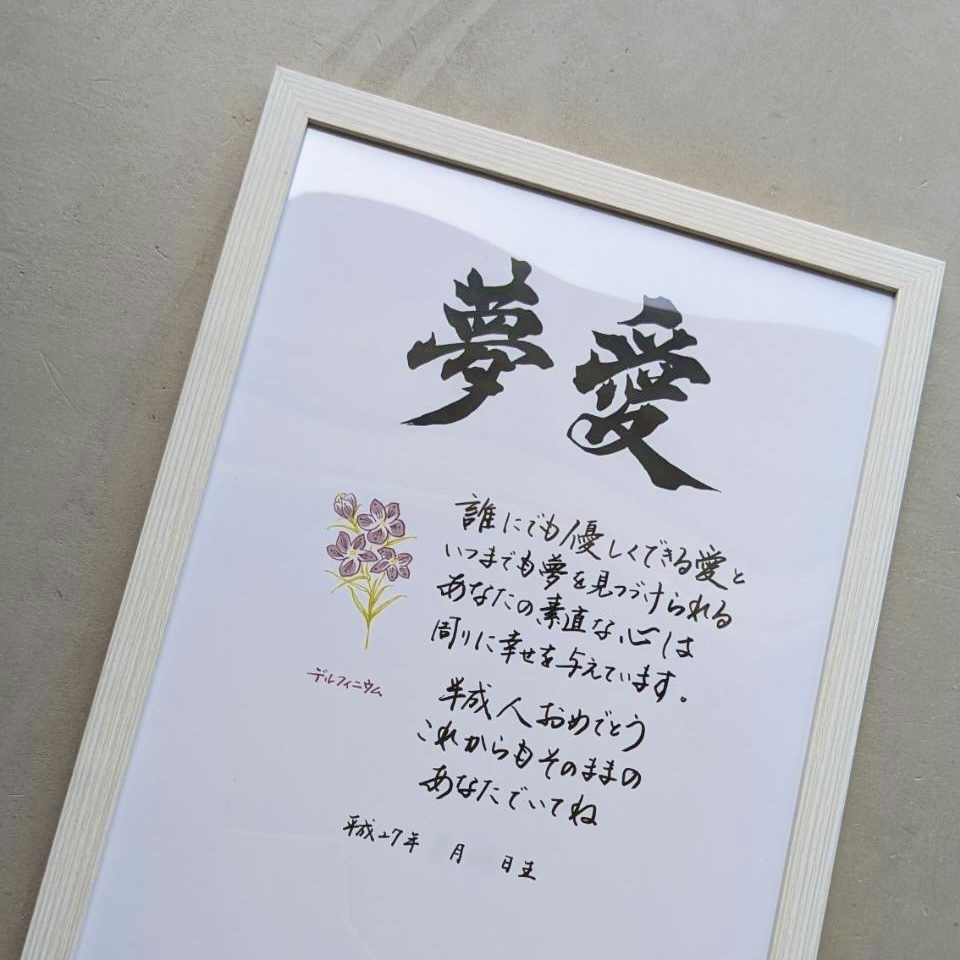 漢字の成り立ちや意味をリサーチし、温かいメッセージを紡ぎ出す「お名前由来メッセージ」付きの特別な命名書です。